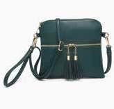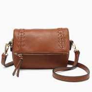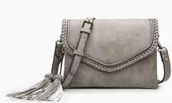 Faux suede crossbody w/ two front zip pockets l Front braided edge flapover snap pocket w/ decorative ring & tassel l Adjustable strap M CC