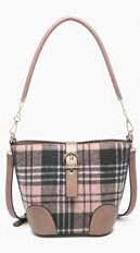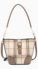 Plaid bucket bag w/ buckle snap closure & vegan leather trim l Inner bag l Removable shoulder strap l Adjustable/removable crossbody strap