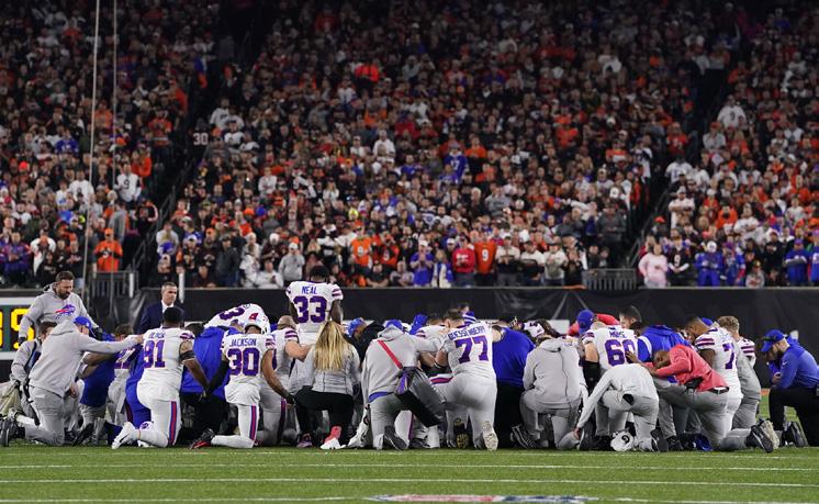 After making a routine tackle against the Cincinnati Bengals in January 2023, Bu$alo Bills safety Damar Hamlin collapsed on the eld mid-game and was soon driven o$ in an ambulance. He was taken to a hospital, where he spent two days in a coma.