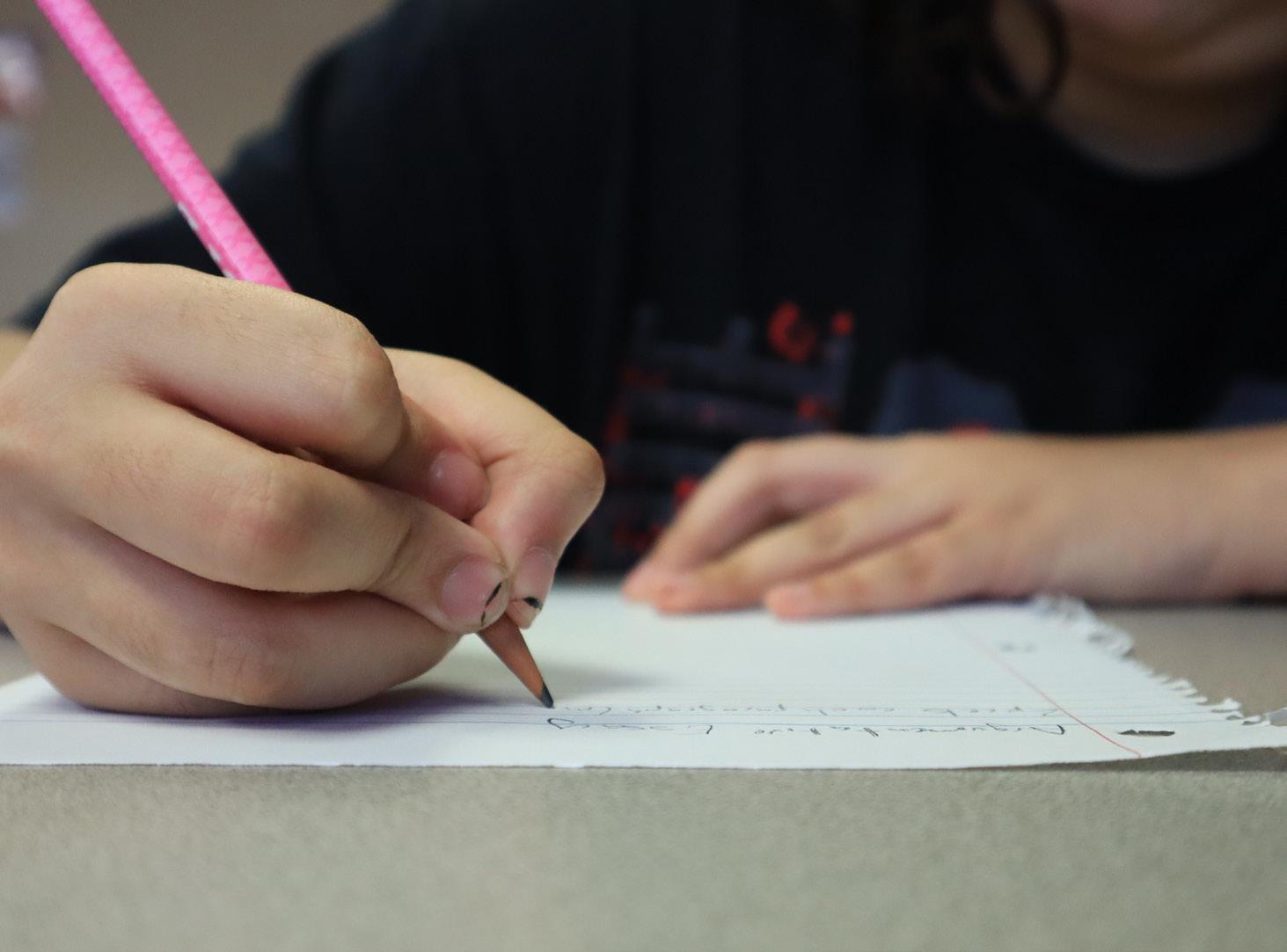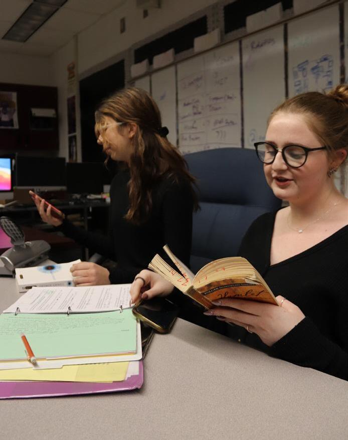 -Adeline Agnew, 12WRITING TIME: Sophomore Izzy Senkel works diligently on an assignment for the class, writing her name and titling the paper as she listens for instructions. LOGAN HAYES | PHOTO DANIELLE STEIN | PHOTO OUT OF ENERGY: Seniors Adeline Agnew and Kaylie Gringas lose the motivation to complete their math class assignment, opting for an alternative.