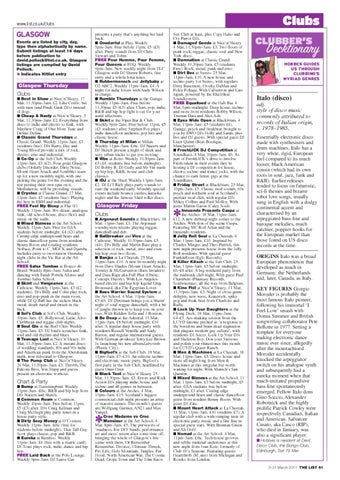 Mar, 11pm–3am. £3. The Argonaut soundsystem returns playing reggae, dancehall and dub. ■ Ballbreaker and Vice at the Cathouse. Weekly 10.30pm–3am. £5 (£4). DJs Billy and Martin Bate play a selection of rock, metal, emo and even hip hop over two floors. ■ Banjax at La Cheetah. 25 Mar, 11pm–3am. £10. A new bi-monthly night from Dave Shades (Mount Heart Attack), Tommy & McGarvatron (Bass Invaders) and Data Rape aka Full Phat (Obese, Concept Theory). With Los Angelesbased electro and hip hop legend Greg Broussard, aka The Egyptian Lover. ■ Bass Warrior Sound System at the Art School. 4 Mar, 11pm–3am. £5–£6. DJ Dirtsman brings you a blazin’ night of total reggae dancehall, with a bit of jungle thrown in to keep you on your toes. With Riddim Tuffa and J Bostron. ■ Be Deep at the Admiral. 11 Mar, 11pm–3am. £8 before midnight; £10 after. A regular deep house party with residents Russell Ventilla and Andy Barton, and regular international guests. With German producer Terry Lee Brown Jr, launching his new albumLabyrinth (Plastic City). ■ Bigfoot’s at the Sub Club. 18 Mar, 11pm–3am. £7–£10. An eclectic techno and electronic music party. Bigfoot’s first party in the Sub Club, headlined by guest Onur Ozer. ■ Black Tent at Nice’n’Sleazy. 25 Mar, 11.30pm–3am. £3. Errors and Rock Action DJs playing indie, house and techno and all genres in between. ■ Colours at the Arches. 4 Mar, 10pm–3am. £15. Scotland’s biggest commercial club night presents an array of massive names. This month’s guests are Wolfgang Gartner, AN21 and Max Vangel. at the Art School. 4 ✽ Mar, 8pm–3am. £5. The purveyors of Croc Madame vs Croc Monsieur