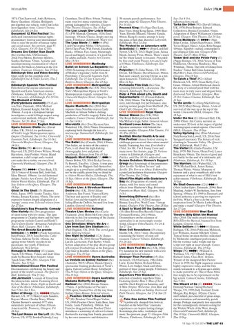 (tbc) (2014) The multi-award-winning Billy Elliot the Musical, beamed live from London. General release. White Settlers (15) ●●●●● (Simeon Halligan, UK, 2014) Pollyanna McIntosh, Lee Williams, Joanne Mitchell. 82min. Typical home-invasion thriller, redeemed by McIntosh’s intelligent performance, but the violence lacks weight and the script isn’t tight or smart enough. Cameo Cinema, Edinburgh, Thu 25 Sep. Wings (PG) ●●●●● (William A Wellman, US, 1927) Buddy Rogers, Richard Arlen, Clara Bow. 144min. Winner of the inaugural Best Picture Oscar in 1929, the flight sequences remain highly impressive today, and the film stands testament to a bygone age’s ability to make powerful art. One of those films that simply has to be experienced on the big screen. Cameo Cinema, Edinburgh, Sun 5 Oct. The Wizard of Oz (U) ●●●●● (Victor Fleming/Norman Taurog/Richard Thorpe, US, 1939) Judy Garland, Frank Morgan, Ray Bolger. 102min. Classic stuff indeed, just chockful of great songs, characterisation and memorably garish design. Perhaps marginally less enjoyable for the curmudgeonly element rooting for the Wicked Witch of the West, though. Cineworld Fountain Park, Edinburgh, Thu 18 Sep; Cineworld IMAX, Glasgow, Thu 18 Sep. 18 Sep–16 Oct 2014 THE LIST 63