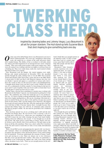 n the cusp of her debut Fringe show, Lucy Beaumont is not one to follow traditional paths. Two years ago, struggling to find acting work, she ended up as a cleaner at the same university where she’d studied drama. The ability of her co-workers to tell jokes about any subject provided inspiration for an unexpected new career: stand-up comedy. ‘They were really good women; really good, banter-wise. They were all women I was working with but you might as well have been on a building site. They were really funny, really fast. And I started to think then that I’d like to do comedy.’ Once Beaumont took the plunge, she started gigging every night. Having only turned professional in December 2012, she ascended quickly through the ranks, finding time to win the BBC New Comedy Award and Chortle’s Best Newcomer, create and star in the BBC Radio 2 sitcom pilot To Hull and Back with Maureen Lipman, have her very own Radio 4 special and appear as a panellist on various radio shows. Now she’s ready to take it to the next level with a solo Edinburgh hour. ‘I thought about doing it last year but I wasn’t ready. I think I am ready now. It’s a culmination of all the comedy I’ve been doing for the last two years and I’ve put it together with a lot of new stuff so it feels like I’m at the right place to showcase how far I’ve come.’ Johnny Vegas, who has been something of a mentor since working with Beaumont on that Radio 4 special, was instrumental in getting her to that place. ‘He’s definitely one of the best stand-ups we’ve ever produced,’ she says. ‘It’s been a lasting working partnership. What you forget about him is how highly intelligent he is. He can do everything. Obviously he’s great at comedy but he can act, direct, write and he even gave me a good quote for the poster [“She’s got the timing of Les Dawson”]. He bigged me up and you need someone like that. After the stand-up show I did last year with him in Hull, I became famous there overnight because they realised that Johnny Vegas was with me. It sometimes takes someone like that for people to think “oh, she must be good then if he’s bothered about her”.’ That one-hour special was set in a working men’s club and she also describes her Fringe show, We Can Twerk it Out, as having ‘a bit of a working men’s club feel to it’, which may owe something to the funny and bold women she met while cleaning, but goes back much further. Talking about her influences she reveals: ‘I was brought up on all the old sitcoms. My mum used to watch them so much: Steptoe and Son, In Sickness and in Health, Only Fools and Horses. We had videos in the house of all the old comedians. There was a show called The Comedians in the 70s and I used to watch that on video. It was really old-fashioned humour.’ With a broad Hull accent and peppering her speech with ‘you knows’ and ‘summats’, there’s no mistaking Beaumont’s regional origins. She recognises the specificity of her diction but doesn’t worry about getting lost in translation. ‘Everyone understands the concept of being a smalltown girl moving to a city. There are always one or two references that they won’t get but that don’t matter.’ This sense of community is important to her. Following the support she’s had, from Vegas among others, she plans to give back. ‘There are not enough mentors in the arts.