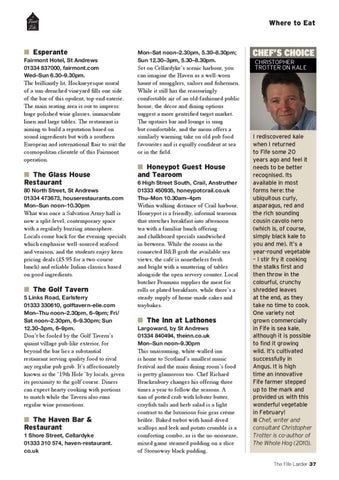 Set on Cellardyke’s scenic harbour, you can imagine the Haven as a well-worn haunt of smugglers, sailors and Àshermen. While it still has the reassuringly comfortable air of an old-fashioned public house, the décor and dining options suggest a more gentriÀed target market. The upstairs bar and lounge is snug but comfortable, and the menu offers a similarly warming take on old pub food favourites and is equally conÀdent at sea or in the Àeld.