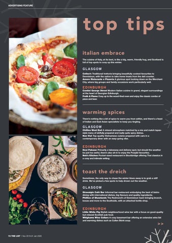 GLASGOW Stravaigin Café Bar Informal bar-restaurant embodying the best of bistro dining with international dishes, big flavours and quality ingredients. Phillies of Shawlands The Redmond’s of Dennistoun team bringing brunch, booze and more to the Southside, with an attached bottle shop.