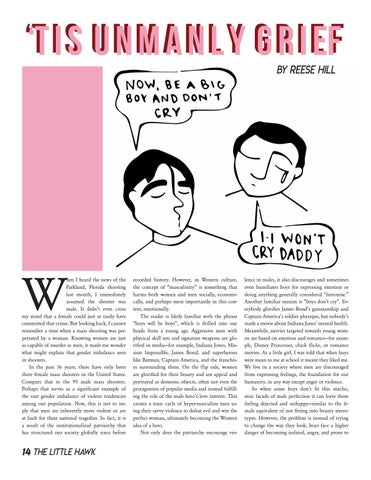 lence in males, it also discourages and sometimes even humiliates boys for expressing emotion or doing anything generally considered “feminine.” Another familiar maxim is “boys don’t cry”. Everybody glorifies James Bond’s gunmanship and Captain America’s soldier physique, but nobody’s made a movie about Indiana Jones’ mental health. Meanwhile, movies targeted towards young women are based on emotion and romance—for example, Disney Princesses, chick flicks, or romance movies. As a little girl, I was told that when boys were mean to me at school it meant they liked me. We live in a society where men are discouraged from expressing feelings, the foundation for our humanity, in any way except anger or violence. So when some boys don’t fit this macho, stoic facade of male perfection it can leave them feeling dejected and unhappy—similar to the female equivalent of not fitting into beauty stereotypes. However, the problem is instead of trying to change the way they look, boys face a higher danger of becoming isolated, angry, and prone to