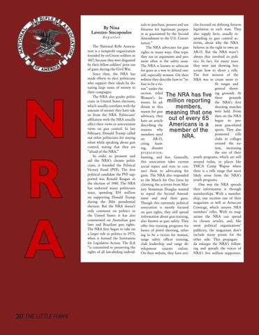 The National Rifle Association is a nonprofit organization founded by ex-Union soldiers in 1817, because they were disgusted by their fellow soldiers’ poor use of guns during the Civil War. Since then, the NRA has made efforts to elect politicians who support their ideals by donating large sums of money to their campaigns. The NRA also grades politicians in United States elections, which usually correlates with the amount of money they have taken from the NRA. Politicians’ affiliation with the NRA usually affect their views or non-existent views on gun control. In late February, Donald Trump called out other politicians for staying silent while speaking about gun control, stating that they are “afraid of the NRA.” In order to promote and aid the NRA’s chosen politicians, it founded the Political Victory Fund (PVF). The first political candidate the PVF supported was Ronald Reagan in the election of 1980. The NRA has endorsed many politicians since, spending $54 million on supporting Donald Trump during the 2016 presidential election. But the NRA doesn’t only comment on politics in the United States: it has also commented on Australian gun laws and Brazilian gun rights. The NRA first began to take on a larger role in politics in 1975, when it formed the Institution for Legislative Action. The ILA “is committed to preserving the rights of all law-abiding individ-