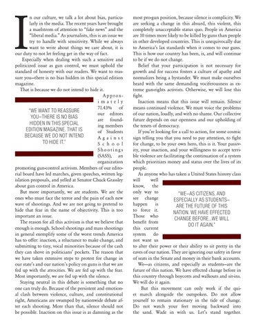 n our culture, we talk a lot about bias, particularly in the media. The recent years have brought a maelstrom of attention to “fake news” and the “liberal media.” As journalists, this is an issue we try to handle with sensitivity. While we always want to write about things we care about, it is our duty to not let feeling get in the way of fact. Especially when dealing with such a sensitive and politicized issue as gun control, we must uphold the standard of honesty with our readers. We want to reassure you—there is no bias hidden in this special edition magazine. That is because we do not intend to hide it. Approximately 71.43% of “WE WANT TO REASSURE our editors YOU—THERE IS NO BIAS are foundHIDDEN IN THIS SPECIAL ing members EDITION MAGAZINE. THAT IS of Students BECAUSE WE DO NOT INTEND Against TO HIDE IT.” S c h o o l Shootings (SASS), an organization promoting gun-control activism. Members of our editorial board have led marches, given speeches, written legislation proposals, and yelled at Senator Chuck Grassley about gun control in America. But more importantly, we are students. We are the ones who must face the terror and the pain of each new wave of shootings. And we are not going to pretend to hide that fear in the name of objectivity. This is too important an issue. The reason for all this activism is that we believe that enough is enough. School shootings and mass shootings in general exemplify some of the worst trends America has to offer: inaction, a reluctance to make change, and submitting to tiny, vocal minorities because of the cash they can shove in politicians’ pockets. The reason that we have taken extensive steps to protest for change in our state’s and our nation’s policy on guns is that we are fed up with the atrocities. We are fed up with the fear. Most importantly, we are fed up with the silence. Staying neutral in this debate is something that no one can truly do. Because of the persistent and emotional clash between violence, culture, and constitutional right, Americans are swamped by nationwide debate after each shooting. More than that, silence should not be possible. Inaction on this issue is as damning as the
