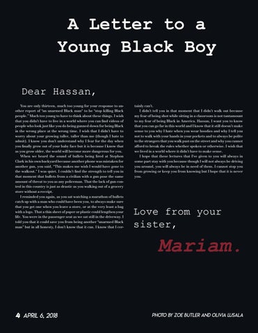 A Letter to a Young Black Boy Dear Hassan, You are only thirteen, much too young for your response to another report of “an unarmed Black man“ to be “stop killing Black people.” Much too young to have to think about these things. I wish that you didn’t have to live in a world where you can find videos of people who look just like you do being gunned down for being Black in the wrong place at the wrong time. I wish that I didn’t have to worry about your growing taller, taller than me (though I hate to admit). I know you don’t understand why I fear for the day when you finally grow out of your baby face but it is because I know that as you grow older, the world will become more dangerous for you. When we heard the sound of bullets being fired at Stephon Clark in his own backyard because another phone was mistaken for another gun, you said, “This makes me wish I would have gone to the walkout.” I was quiet. I couldn’t find the strength to tell you in that moment that bullets from a civilian with a gun pose the same amount of threat to you as any policeman. That the lack of gun control in this country is just as drastic as you walking out of a grocery store without a receipt. I reminded you again, as you sat watching a marathon of bullets catch up with a man who could have been you, to always make sure that you get one when you leave a store, or at the very least a bag with a logo. That a thin sheet of paper or plastic could lengthen your life. You were in the passenger seat as we sat still in the driveway. I told you that it could save you from being another “unarmed Black man” but in all honesty, I don’t know that it can. I know that I cer-