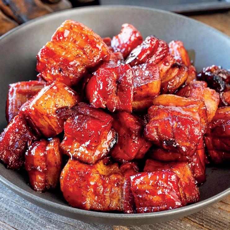 When the BBQ has reached the correct temperature, it’s time to add your smoking wood. Cherry smoking wood goes perfectly with the flavour of pork. I actually always use chunks that I stick between the coals, but just do what you find easiest. Place the cubes on your BBQ grill and close the lid of the BBQ. You’ll now leave the cubes of pork belly to cook for 2.5 hours. So, all you have to do is check the temperature of the BBQ from time to time. Remove the pork belly cubes from the BBQ after 2.5 hours and put them in a BBQ-resistant baking dish or a disposable aluminium BBQ dish.