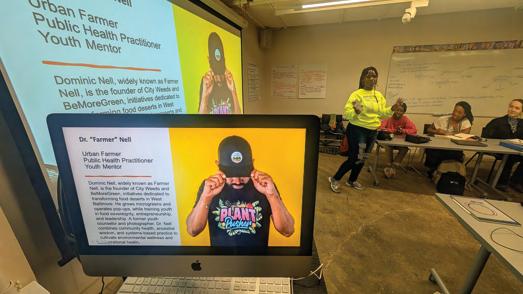 Dr. Dominic Nell (he/him), a ectionately called Farmer Nell, is a farmer and the Founder of City Weeds. Dominic’s farming budded from a desire to do something about the vacant lots in the City. A longtime youth counselor and photographer, Dominic’s City Weeds grew from him learning to grow microgreens, seven to 10-day-old vegetable greens with a high nutrient density. Dominic promotes youth empowerment with Be More Green, the storefront for City Weeds’ microgreens, local farm produce, pressed juices, and other natural, grassroots products predominantly made by Black-owned businesses. It also provides the youth a resource space for the iCare Foundation and For My Kidz, which o ers workforce development, and a multi-purpose room, including a science lab for B’More Engaged, which has a Johns Hopkins University association. In addition, City Weeds o ers green food options for Baltimore’s food-insecure neighborhoods through markets, online orders, and pop-ups. Dominic’s brick-and-mortar grocery and community hub is located in the heart of West Baltimore. His life’s work is to change West Baltimore and in uence the youth to control what they eat and create their own destiny.