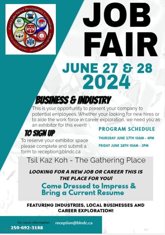 BLNDC Job Fair June 27 10am4pm and June 28 10am-3pm at the Ts’il Jaz Koh The Gathering Place. Looking for a new job or career this is the place for you! For more info contact reception@blndc.ca or 250692-3188
