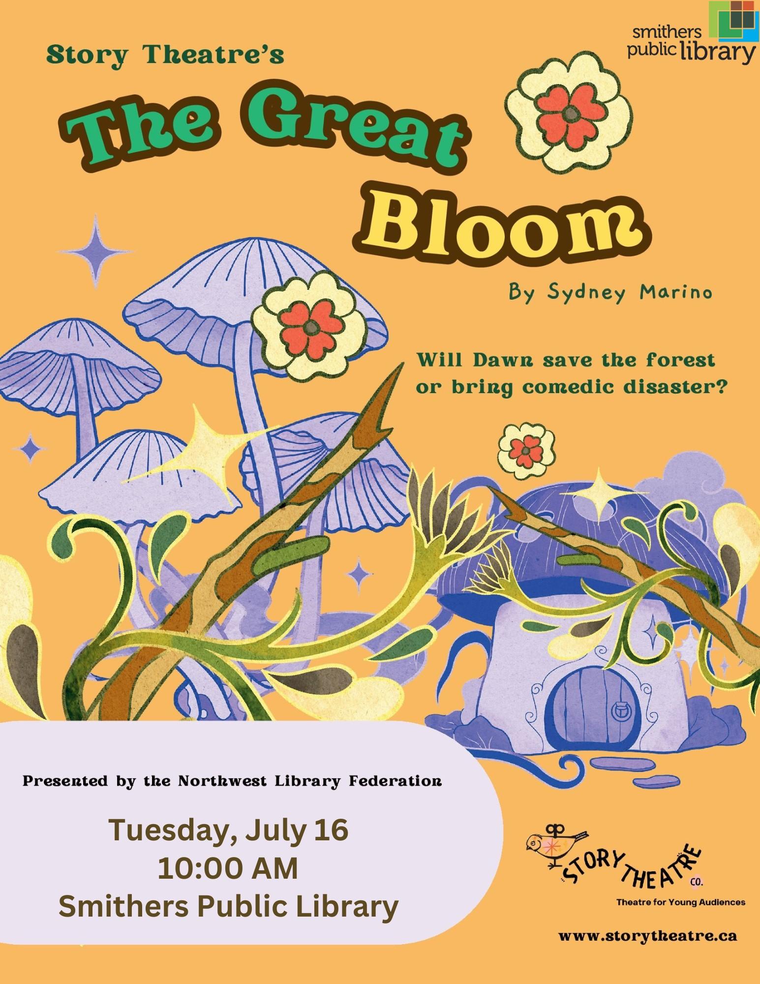 Story Theatre’s The Great Bloom Jul 16 10am at the Smithers Public Library. Join us for a special presentation from the Story Theatre Company. Dawn, a magical forest spirit, must embark on a journey to save the forest. But she doesn’t feel ready, and her efforts result in disaster! “The Great Bloom” by Sydney Marino is a new Canadian comedy about discovering the value we add to the world, even, or especially, when our path looks different from others. Generously sponsored by the Northwest Library Federation.