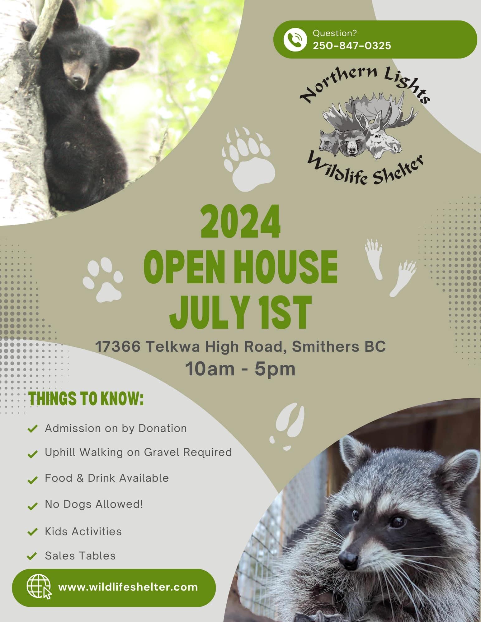 Open House Jul 1 10am-5pm. 17366 Telkwa High Road. Admission by donation, uphill walking on gravel required, food & drink available, no dogs allowed, kids activities, sales tables.