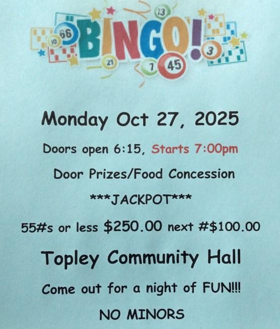 Wed is Sip’n'Stitch at 11am 1st and 3rd Wed is Bingo. 1st number called at 7pm