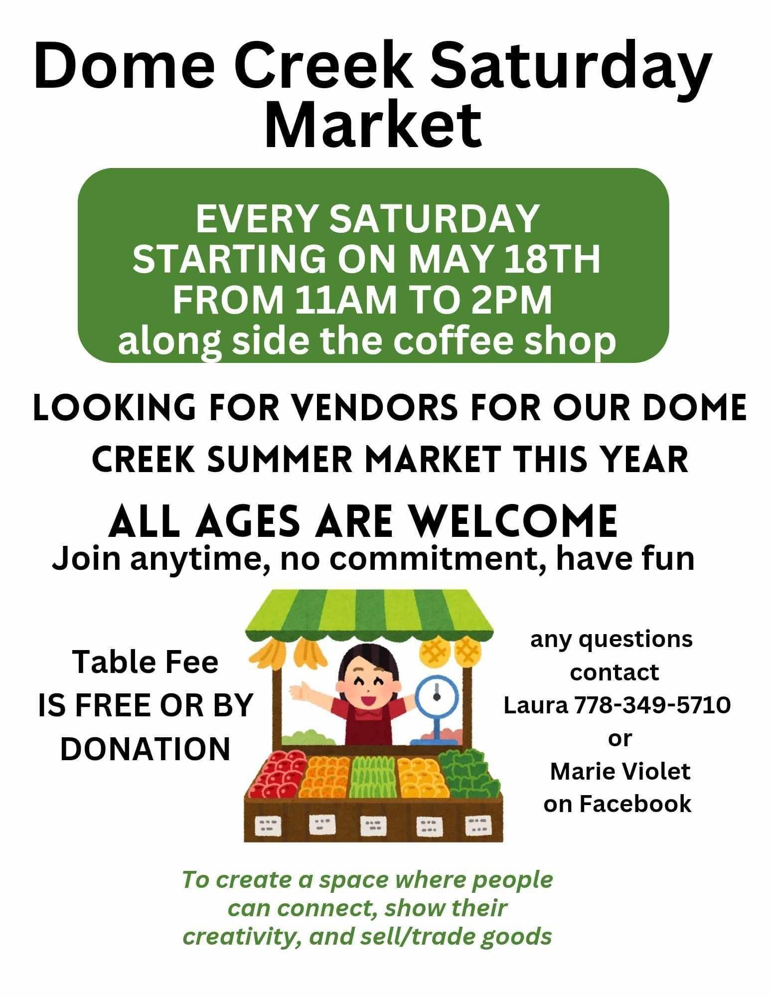 Dome Creek Saturday Market—Every Saturday starting May 18 from 11am-2pm alongside the coffee shop. Looking for vendors. All ages welcome. Table fee is free or by donation. For more info call Laura at 778-349-5710