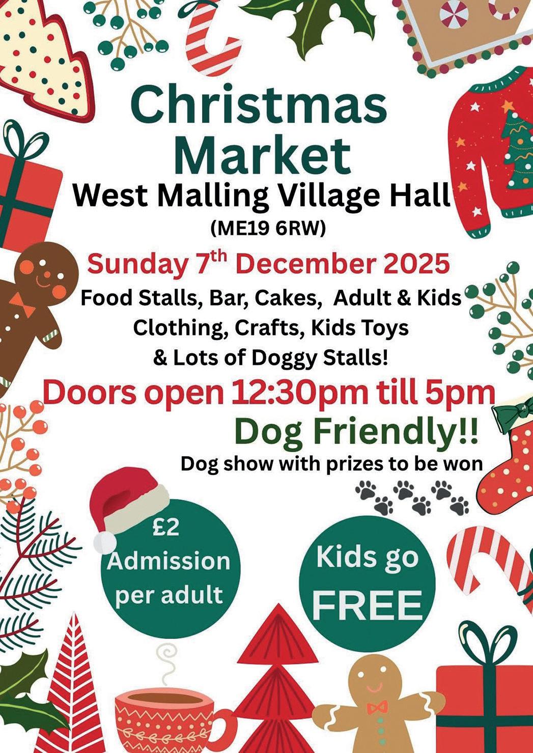 Sunday 7 Dec 12.30-5pm Christmas Market at West Malling Village Hall. See p28
