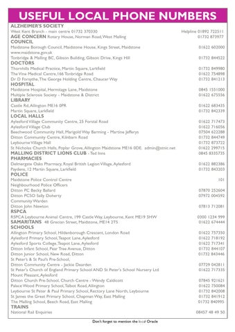 USEFUL LOCAL PHONE NUMBERS ALZHEIMER'S SOCIETY West Kent Branch - main centre 01732 370330 AGE CONCERN Rotary House, Norman Road, West Malling COUNCIL Maidstone Borough Council, Maidstone House, Kings Street, Maidstone www.maidstone.gov.uk Tonbridge & Malling BC, Gibson Building, Gibson Drive, Kings Hill DOCTORS Thornhills Medical Practice, Martin Square, Larkfield The Vine Medical Centre,166 Tonbridge Road Dr D Forsythe, The George Holding Centre, Chaucer Way HOSPITAL Maidstone Hospital, Hermitage Lane, Maidstone Multiple Sclerosis Society - Maidstone & District LIBRARY Castle Rd, Allington ME16 0PR Martin Square, Larkfield LOCAL HALLS Aylesford Village Community Centre, 25 Forstal Road Aylesford Village Club Beechwood Community Hall, Marigold Way Barming - Martine Jefferys Ditton Community Centre, Kilnbarn Road Leybourne Village Hall St Nicholas Church Halls, Poplar Grove, Allington Maidstone ME16 0DE. admin@stnic.net MALLING DISTRICT LIONS CLUB - Ted Inns PHARMACIES Delmergate Oaks Pharmacy, Royal British Legion Village, Aylesford Paydens, 12 Martin Square, Larkfield POLICE Maidstone Police Control Centre Neighbourhood Police Officers Ditton PC Becky Ballard Ditton PCSO Sally Doherty Community Warden Ditton John Newton RSPCA RSPCA Leybourne Animal Centre, 199 Castle Way, Leybourne, Kent ME19 5HW SAMARITANS 48 Grecian Street, Maidstone, ME14 2TS SCHOOLS Allington Primary School, Hildenborough Crescent, London Road Aylesford Primary School, Teapot Lane, Aylesford Aylesford Sports College, Teapot Lane, Aylesford Ditton Infant School, Pear Tree Avenue, Ditton Ditton Junior School, New Road, Ditton St Peter’s & St Paul’s Pre-School, Ditton Community Centre - Jackie Dearden St Peter's Church of England Primary School AND St Peter's School Nursery Ltd Mount Pleasant, Aylesford Ditton Church Pre-School, Church Centre - Wendy Caldicott Palace Wood Primary School, Talbot Road, Allington Leybourne St Peter & Paul Primary School, Rectory Lane North, Leybourne St James the Great Primary School, Chapman Way, East Malling The Malling School, Beech Road, East Malling TRAINS National Rail Enquiries Don’t forget to mention the local Oracle