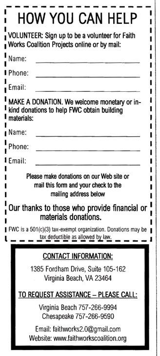 We ask for your partnership in this effort. We ask for your support by way of donations and volunteerism. We need volunteers to serve on our Board of Directors, Committees of the Board, and work on home repair projects. The time commitment can be minimal or more if you are available. Please contact Ray Kirby if you need additional information at rkk3376@aol.com or 757-2873567.