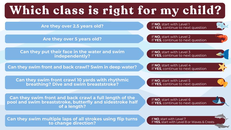 This 4-class session focuses on complete stroke and skill proficiency for all skills previously learned Swimmers will learn the proper use of equipment such as pull buoys, fins, and pace clocks Swimmers also build on competitive skills and endurance training to swim 50 to 100 yards This level prepares swimmers to move on to our Waves & Crests Program The maximum ratio of instructor to participants is 1:7