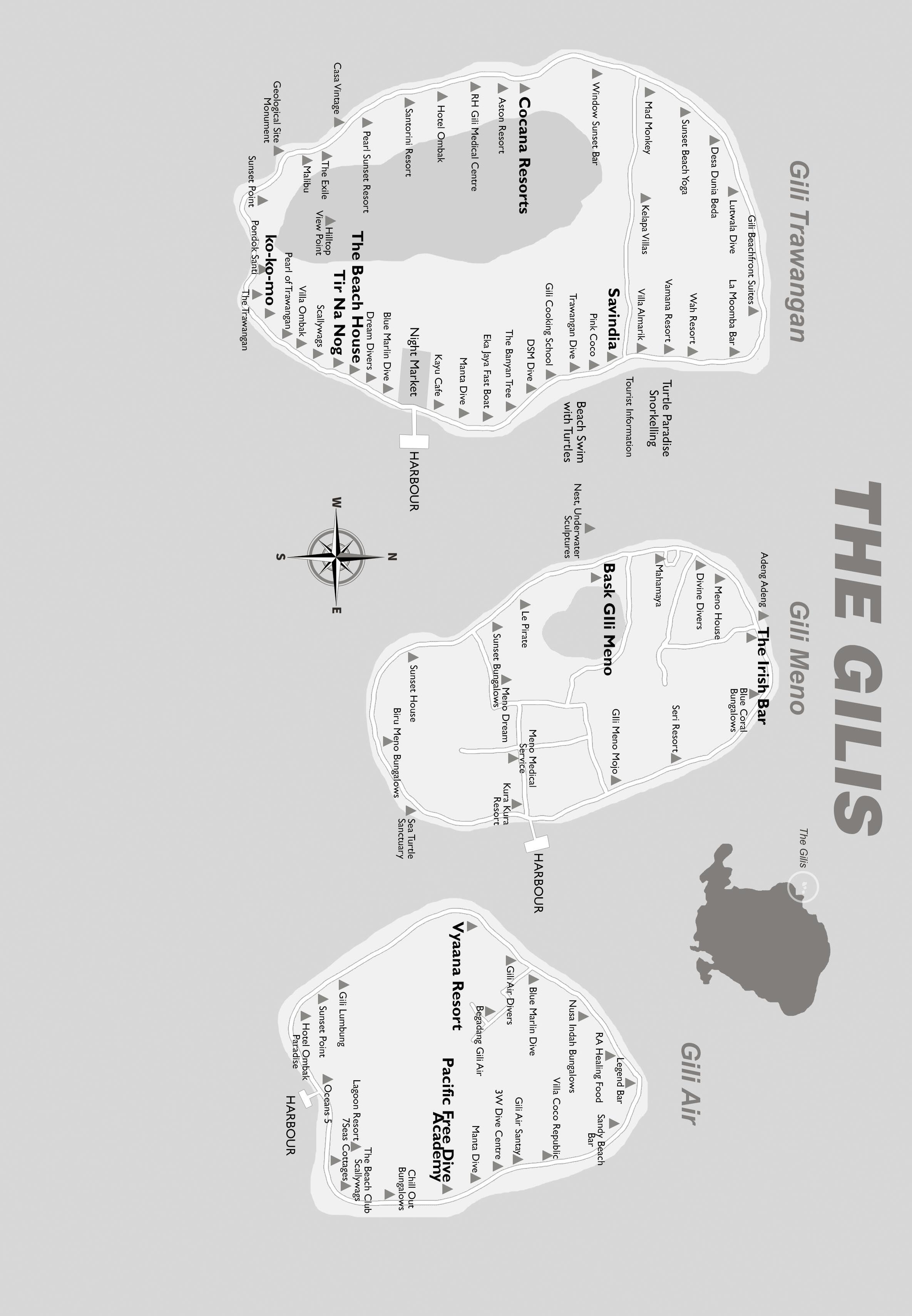 Like all the Gilis, the best swimming beaches and the most tourist facilities (including the boat harbour) are located along the east coast.