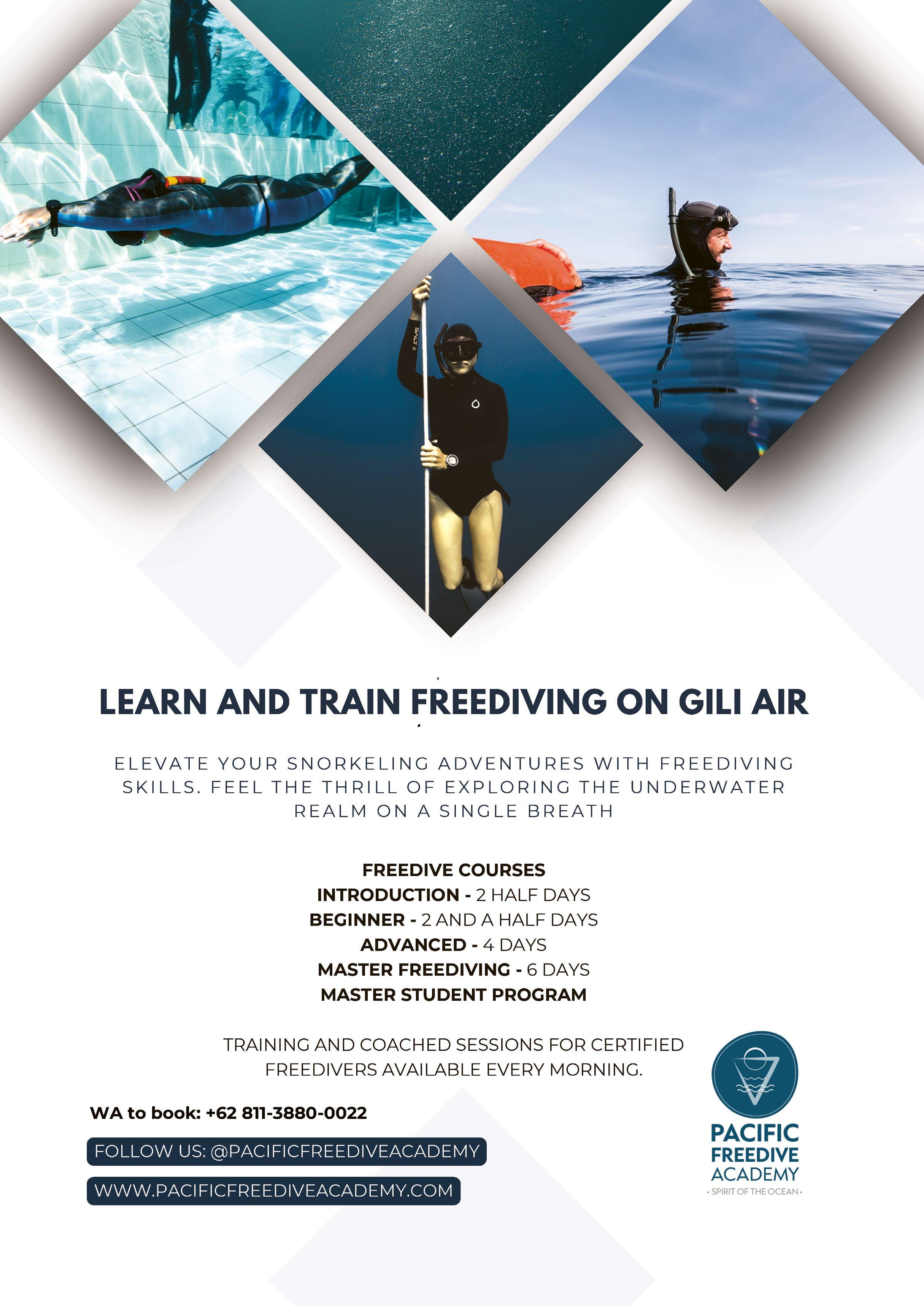 Pacific Freedive Academy on Gili Air are professionals with many years’ experience teaching freediving in a safe and friendly way. They offer both Molchanovs and AIDA courses for beginners through to master level, as well as personalised coaching and freediving bootcamps.
