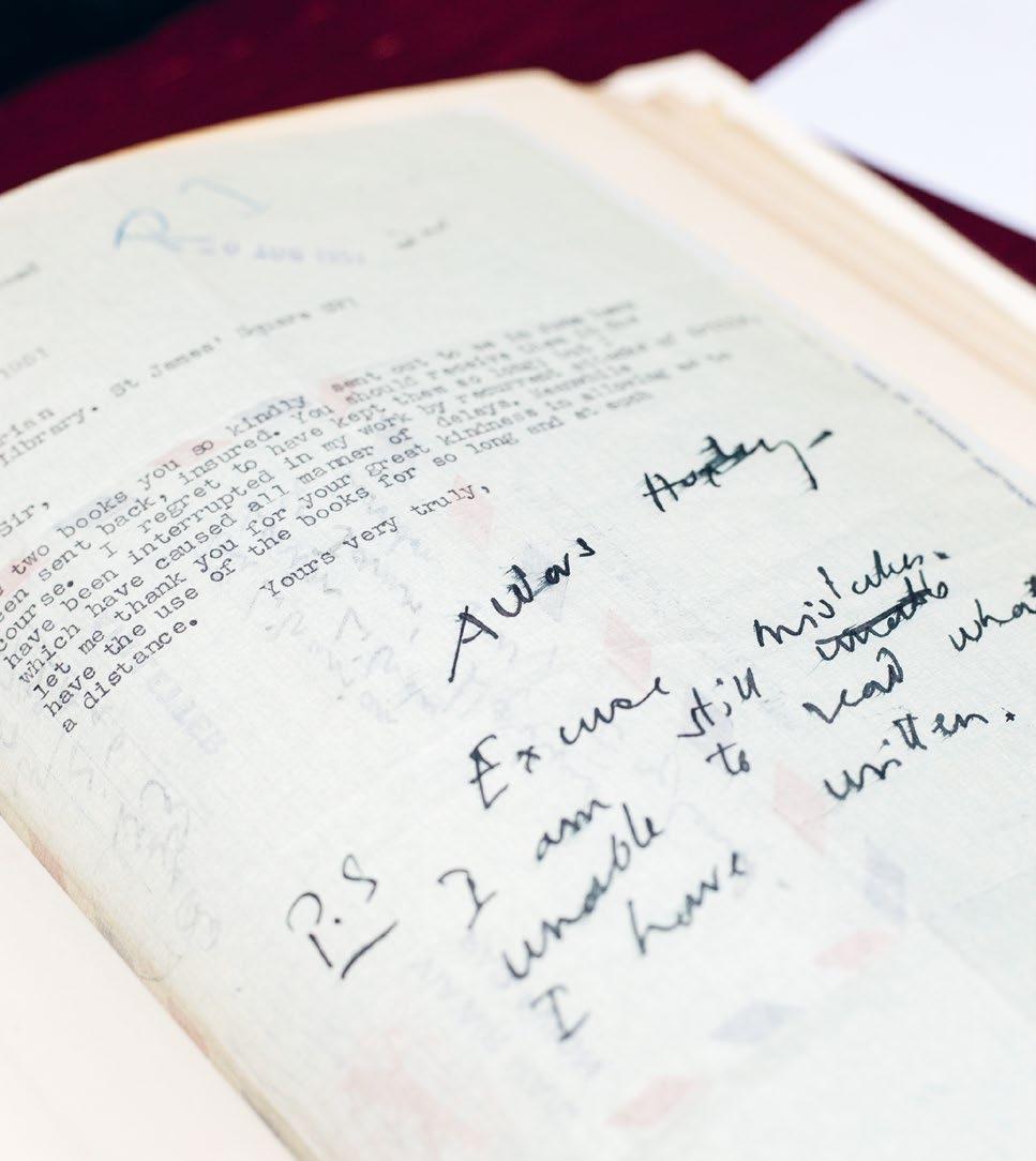 Coming from names like Somerset Maugham, George Bernard Shaw, Barbara Cartland and the exiled Italian revolutionary Giuseppe Mazzini, notes about routine book loans sent to librarians past have more life in them than you might expect. Sometimes this member correspondence, now kept in the Library’s archive, offers something quite personal. A 1951 air mail letter from Los Angeles was typed by Aldous Huxley – who suffered from poor and deteriorating eyesight for much of his life – and thanked the Librarian for the books he received some months ago. “I regret that I have kept them so long,” he wrote. “But I have been interrupted in my work by recurrent attacks of iritis which has caused all manner of delays.” His letter ends with a touching postscript written in his increasingly illegible hand: “Excuse mistakes. I am still unable to read what I have written.”