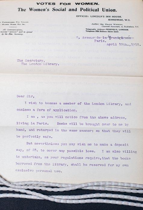 More formal is a two-page letter typed on Women’s Social and Political Union stationery and dated 19 April 1915. It was sent by suffragette Christabel Pankhurst, then living in semi-exile in war-torn Paris, and contains her application for London Library membership. With hostilities on the Western front intensifying (she was writing