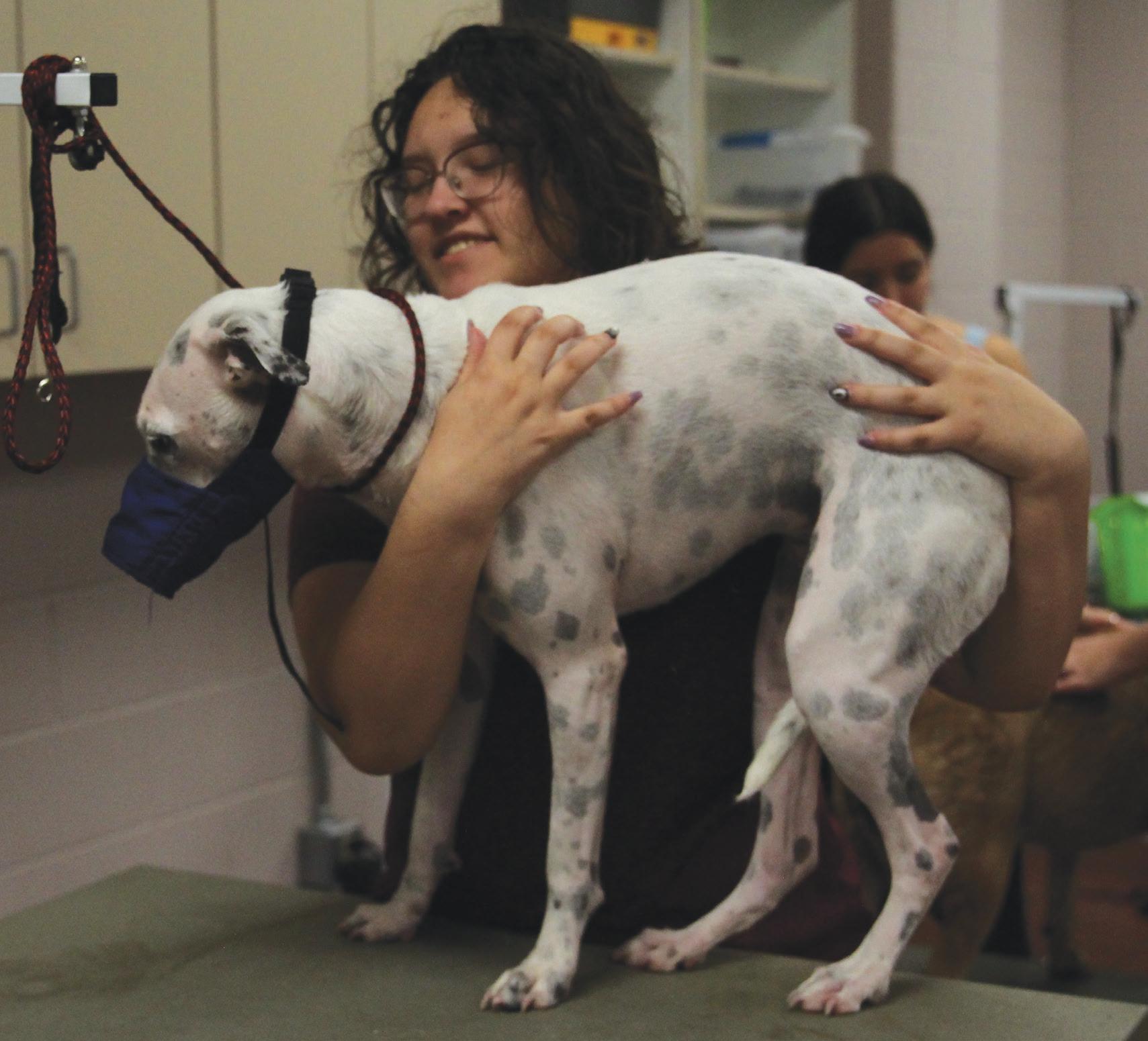 HEAVY HOIST: Senior Ali Pool handles a dog preparing it to get bathed. She's been in FFA since she was a freshman. "I knew I wanted to be a veterinarian," Pool said. "I heard that there is a vet class and I immediately signed up and I found out that FFA is so much more than just farming."