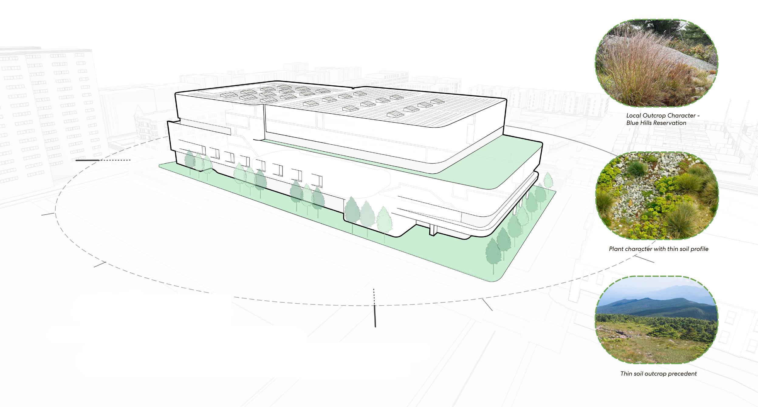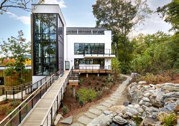 Situated on a rocky and forested promontory along the edges of Norwalk, the building’s unusual siting is both secluded and urban. The land’s topography is tenuous; the linear site itself, oriented along a north-south axis, is surrounded by a combination of second-growth forest, wildlife habitat, transit infrastructure, and medium-density commercial and multifamily residential development. Within this distinct context, McLennan and Stone assembled a design team that could rise to the challenge of designing a four-story, 24,000-square-foot building that simultaneously responded to and restored this once-neglected pocket of land.