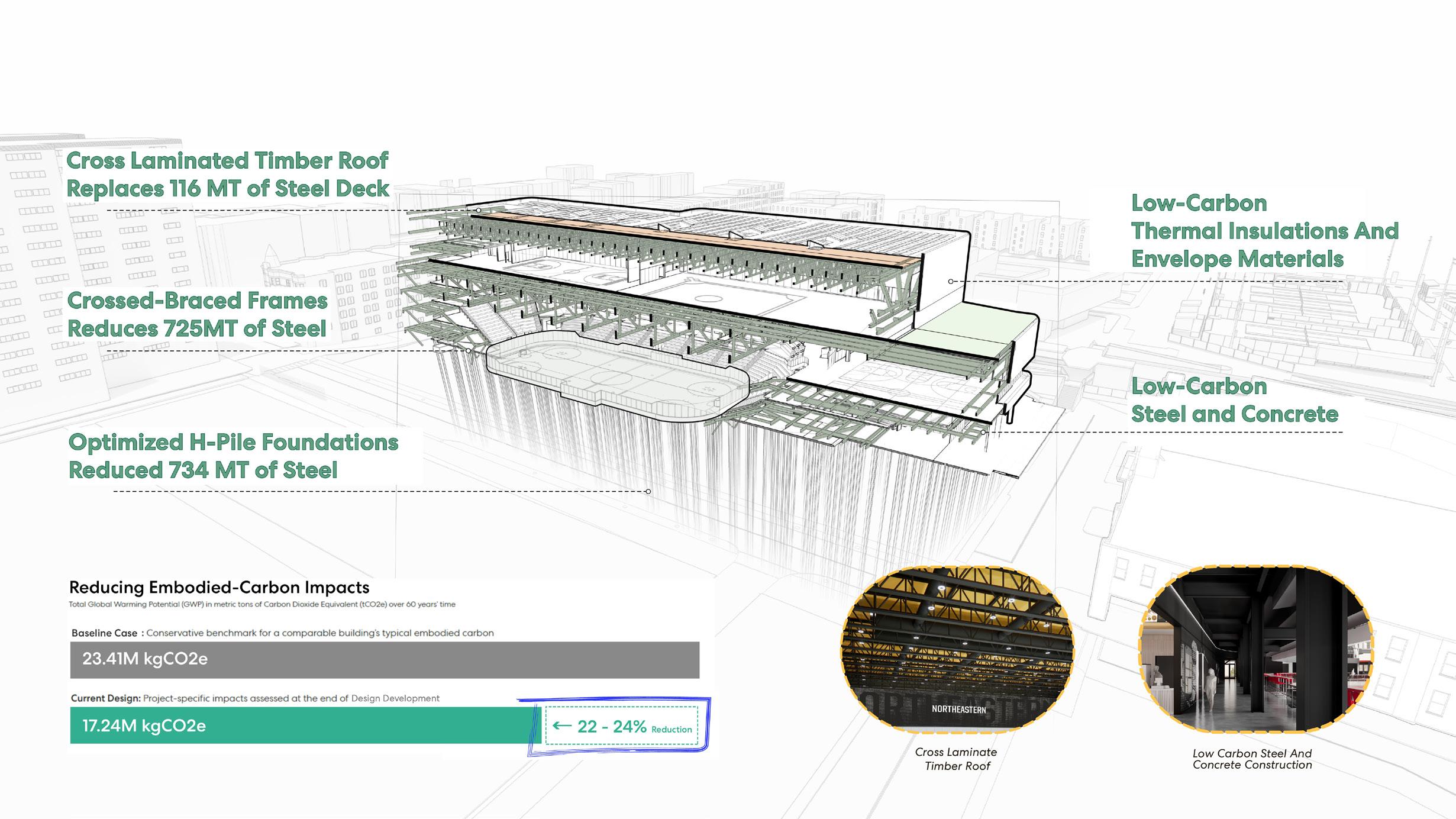 Sports venues are massive structures often built with very carbon-intensive structural systems. Exploring opportunities for mass-timber structures and lower-carbon materials can drastically reduce a project’s embodied carbon.