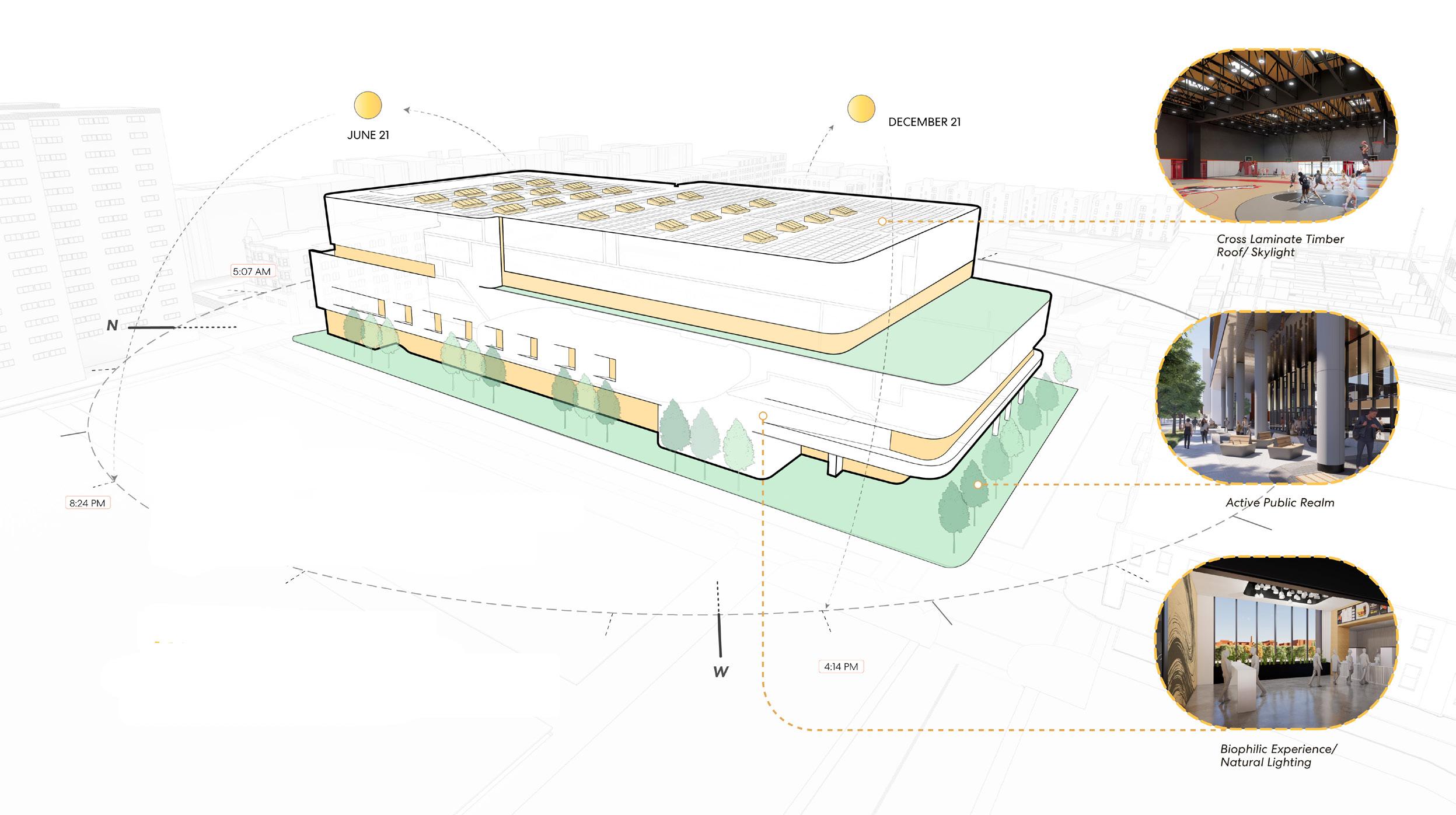 Often, sports venues are located in industrial areas zoned for lower density than central business districts. This means fewer tall buildings nearby and greater opportunities for prime access to natural light and passive thermal gain.