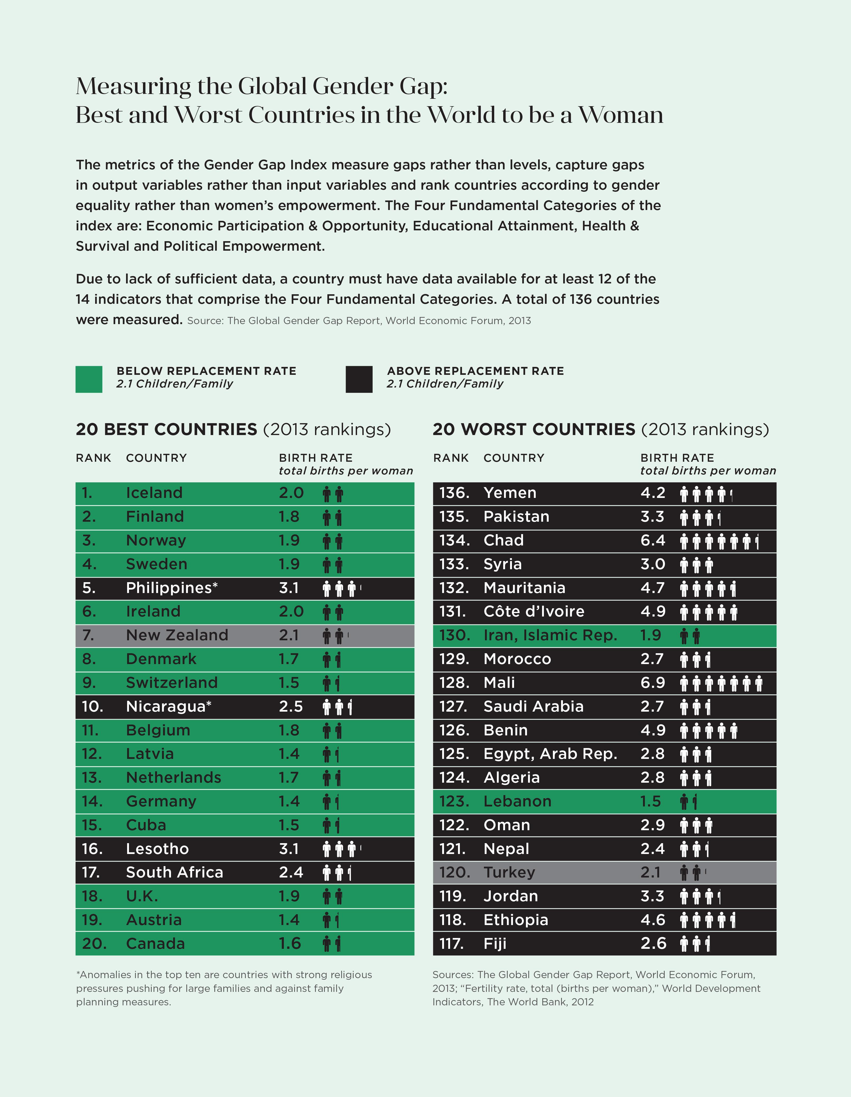 Creating and enforcing hard and fast rules about how many children are allowed by law — legislative, religious, economic or otherwise — for any particular family is not the answer. Draconian solutions that place all the blame for overpopulation on certain segments of the population are also not the answer. China’s one-child policy is a perfect example. Several decades ago, there was an understandable reaction to what the Chinese government saw as a convergence of coming social, economic and environmental crises driven largely by overpopulation. They enacted an unprecedented national policy to immediately address the situation. On a mathematical level, the one-child initiative has been a success — China’s growth rate has been greatly reduced even as the country, for a few more decades at least, continues to grow. 8 But the policy has also created some horrible side effects: gender, disability and ethnic biases; an imbalanced malefemale ratio; and a potentially top-heavy demographic with too few people available to care for a disproportionately large elderly population. In recent months, the policy has been relaxed, and more exceptions have been granted for replacement rate family size. Still, this institutionalized attempt to attack the problem provides a good case study of what does and doesn’t work, especially when compared to countries, such as many in Europe, that did not take such actions yet have achieved similarly significant population growth rate reductions and growth rates below the replacement level of 2.1 (refer to graphic on page 16).