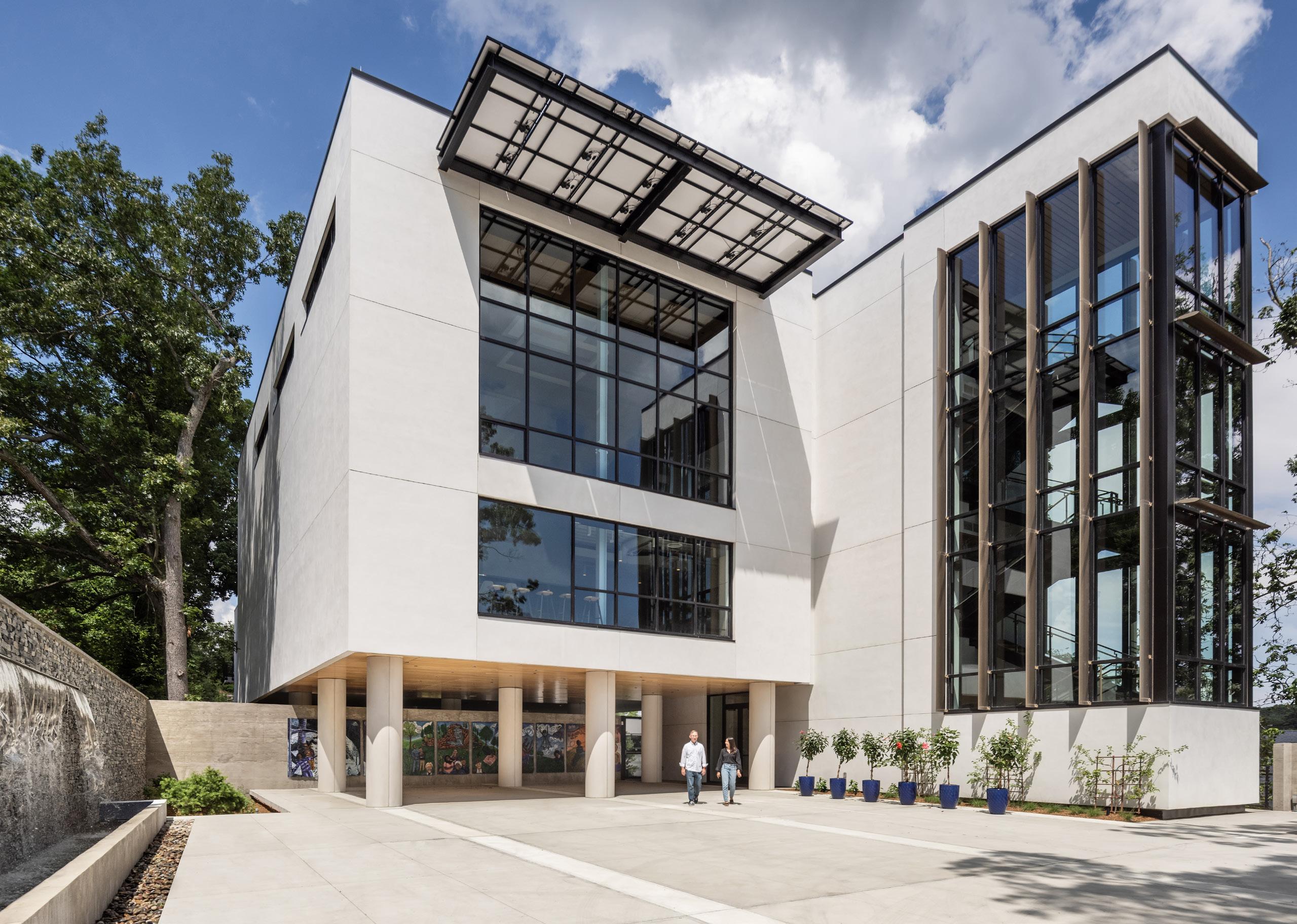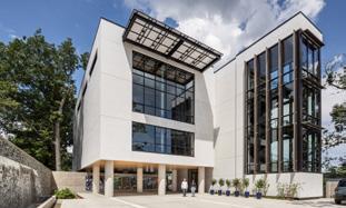 While the western façade was mostly left opaque, the glazed east facades and stair volumes are protected by vertical shading elements to minimize glare and heat gain in the early hours of the day while still allowing some “plays of brilliance” in the form of sun reflecting off of shading fins – and in the winter, allowing for early morning “warm up” of the facility.