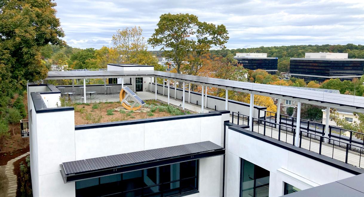 The HMTX World HQ (otherwise known as the ‘House Up On The Hill’) incorporates a diverse range of sustainability measures to fulfill its ambitious standards, proving that a modern design inspired by Bauhaus design principles where form is derived by function, can coincide within a deeply biophilic and deep green philosophical framework. The project has been recognized as the Greenest Building in the State of Connecticut for its sustainability endeavors and was honored with a Metropolis Planet Positive Award in 2023. Daylighting strategies are one of the key sustainability elements of HMTX, contributing both to the overall energy efficiency of the building and to the dynamic experience of moving through it. Let’s examine these aspects more closely.