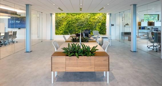 HMTX is a great example of featuring biophilic finish materials throughout the project to improve the project’s connection to nature. One of the outstanding interior features is a 12-foot-tall living wall and thoughtful daylight integration found in the third-floor workspace, which boosts the quality of space for occupants and increases workplace productivity. Lit from above by a concealed skylight, the naturally daylit green wall washes the whole space in winter with direct light centering the plants.