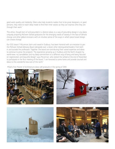 good work quietly and modestly. Elders also help students realize that to be great designers, or good persons, they need to reach deep inside to find their inner voices so they can express who they are through their work.” This ethos, though born of and grounded in a distinct place, is a way of grounding design in any place, uniquely preparing McEwen School graduates for the emerging needs of society in the face of climate change and other global stressors with an intuitive sense of the ways in which place-based design can create change. Our CEO Jason F. McLennan, born and raised in Sudbury, has been honored with an invitation to join the McEwen School Advisory Board alongside over a dozen other distinguished leaders from both in and outside the profession. Together, the board are contributing their varied expertise and ideas to continue to grow the program. “My experience growing up in Sudbury and the North shaped my world-view, my sensibilities and my deep commitment to a different way of living and being focused on regeneration and beautiful design” says McLennan, who visited the school at the end of November to participate in the first meeting of the board. “I am honored to come home and provide counsel and ideas to this wonderful new icon of the north.” MSoA’s first Master of Architecture class will graduate in the spring of 2019.