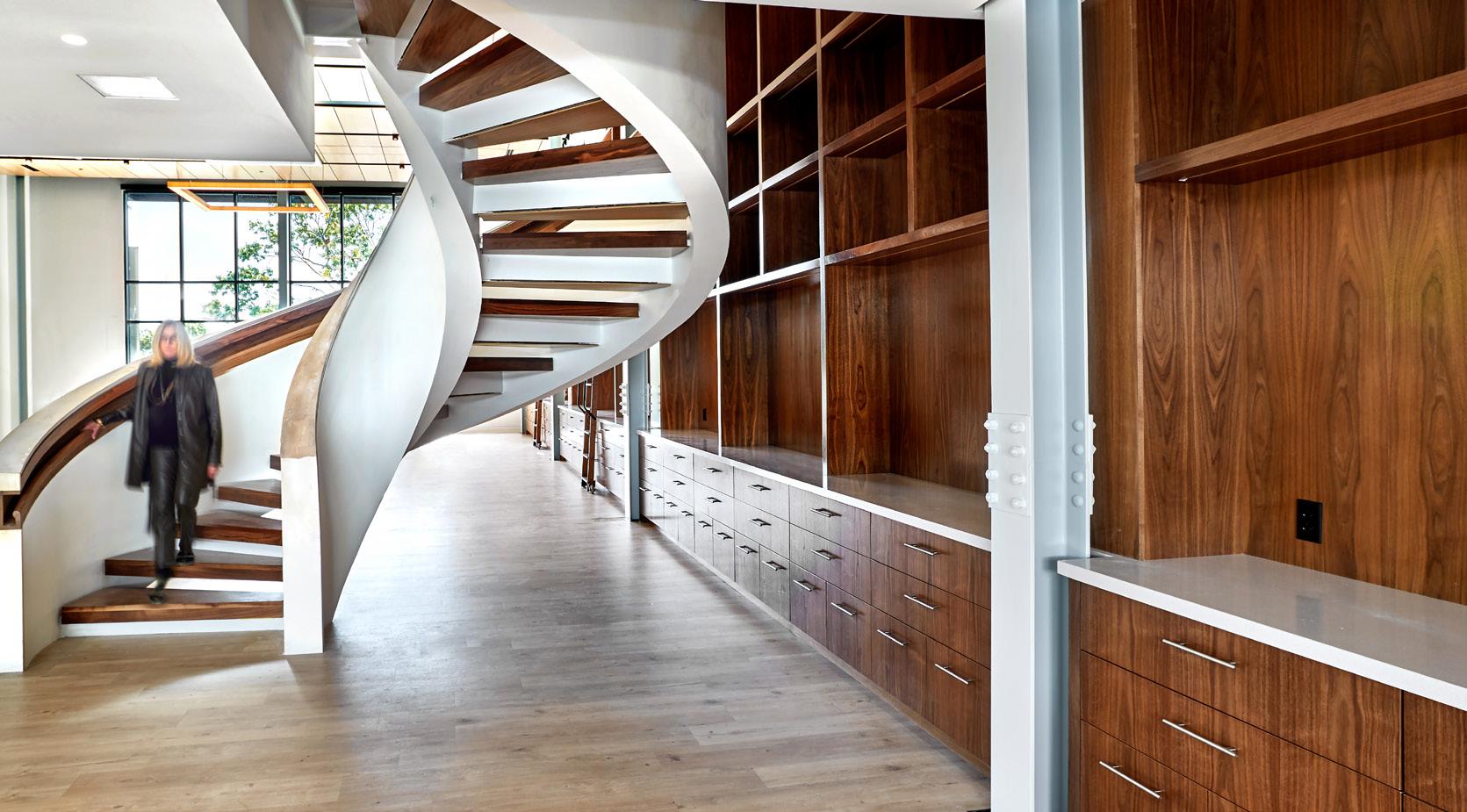 Top Left: Spiral stair and walnut cabinets of Great Hall.