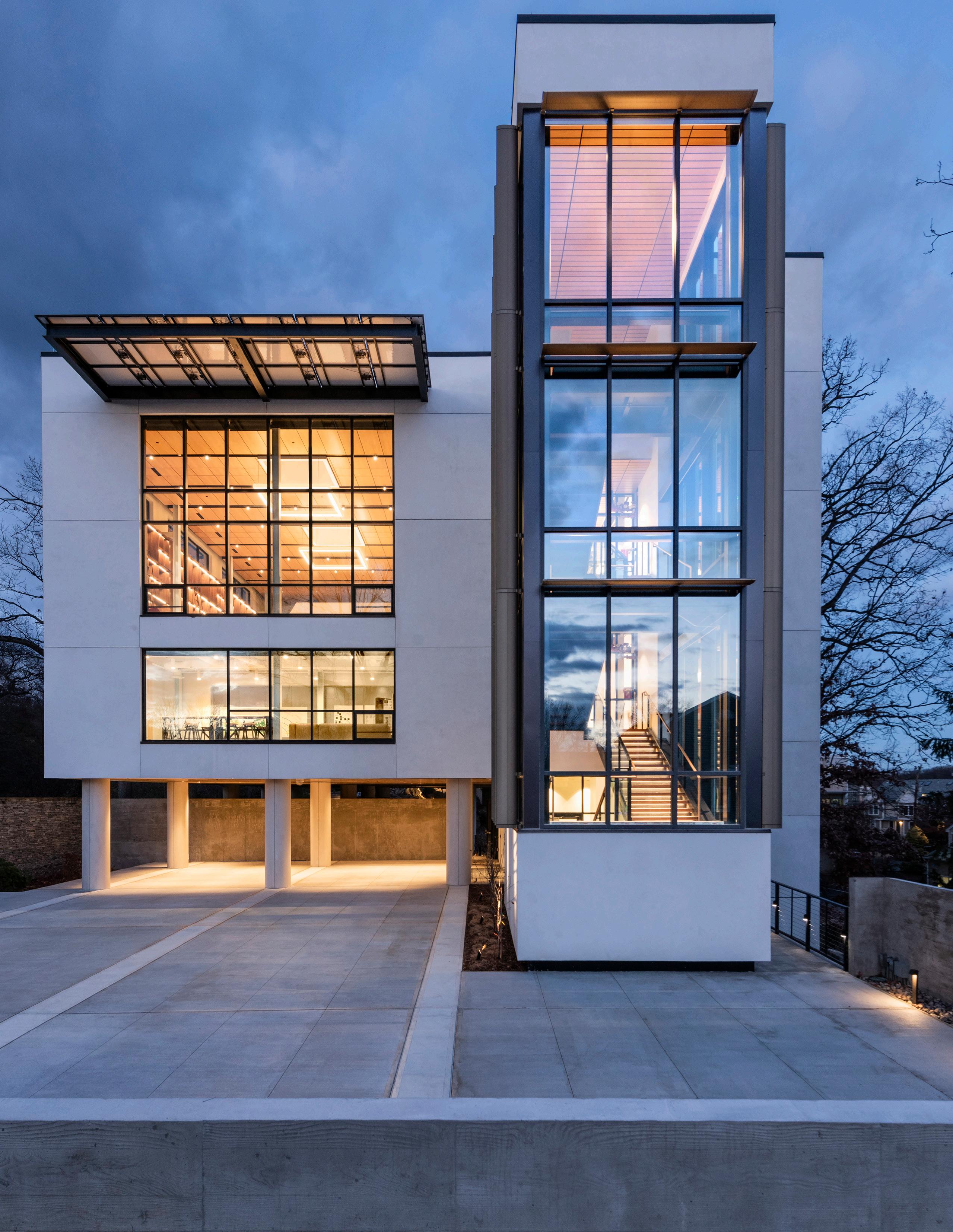 Photo: Paul Godwin Photo: Paul Godwin Photo: Paul GodwinThe building sits perched lightly upon ‘piloti’ columns above an ancient granite slab, and is affectionately called the “The House Upon the Hill” by the client and visionary behind the project. Simple in plan, simple in section, and elegant in execution, the building is designed to nestle into its landscape. Modern in its aesthetic, yet deeply biophilic in its experience, the project provides connection to nature at every turn, with each interior space linked to the outside from at least three orientations. The senses are fully engaged as one walks through the project, encountering the sounds of water falling, the touch of living plants and green walls, the sights of carefully controlled daylight, and the feeling of prospect and refuge offered on every floor.