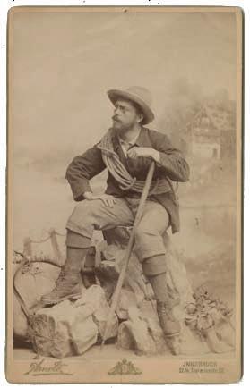 Aufgenommen wurde dieses Porträt im Innsbrucker Atelier des Fotografen Fridolin Arnold. Der 1867 geborene, ursprünglich aus Deutschland stammende Lichtbildner hatte in den 1890er Jahren in der MariaTheresien-Straße ein Fotostudio eröffnet. Stolz präsentierte er Namen, Signet und Adresse in vergoldeten Buchstaben auf dem Untersatzkarton. Und wer ist der Porträtierte? Es handelt sich um den aus Wien stammenden Landschaftsmaler, Alpinisten und Forschungsreisenden Hans Robert Schmitt (1870–1899), der zwar nur knapp 30 Jahre alt wurde, der aber dennoch bis heute zahlreiche nach ihm benannte Routen (die sogenannten „Schmittwege“) im alpinen Gelände des Ostalpenraums hinterlassen hat. Er war ein ausgezeichneter Kletterer, dem viele Erstbesteigungen gelangen, und zudem ein begeisterter Publizist, der viel über die Berge und das Klettern schrieb. 1899 verstarb er an einer tropischen Fiebererkrankung während einer Afrikaexpedition.