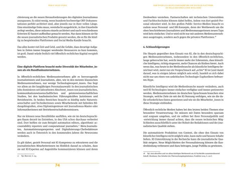 Die Skepsis gegenüber dem Einsatz von KI, die in den deutschsprachigen Medienunternehmen, insbesondere in den öffentlich-rechtlichen, lange geherrschte hat, weicht immer mehr der Erkenntnis, dass künstliche Intelligenz, richtig eingesetzt, mehr Chancen als Risiken bietet. Auch wenn das, was heute in der Medienbranche als künstliche Intelligenz bezeichnet wird, meist nur ein Vorgeschmack auf „echte“ KI ist (und damit darauf, was in einigen Jahren möglich sein wird), handelt es sich dabei nicht nur um einen von unkritischen Technologie-Euphorikern befeuerten Hype. Künstliche Intelligenz wird die Medienbranche massiv verändern, auch weil KI-Technologien immer einfacher verfügbar und immer preiswerter werden. Medienunternehmen im deutschen Sprachraum brauchen eine Strategie, welche Ziele sie mit der KI-Nutzung verfolgen, wie sie die dafür erforderlichen Daten generieren und wie sie die Mitarbeiter_innen in diese Strategie einbinden. Öffentlich-rechtliche Medien haben bei den letzten beiden Themen eine besondere Verantwortung: Sie müssen mit Daten besonders sparsam und sorgsam umgehen, und sie sollten bei ihrer Personalpolitik und -entwicklung immer darauf achten, dass die neuen technischen Möglichkeiten ausschließlich unter der Hoheit der Redaktionen und der journalistischen Qualität stehen. Die automatisierte Produktion von Content, die ohne den Einsatz von künstlicher Intelligenz nicht möglich wäre, kann mehr und bessere Inhalte liefern. KI-Unterstützung in der Recherche kann die journalistische Qualität steigern. Neue Möglichkeiten der Personalisierung können die Kundenbindung verbessern und dazu beitragen, junge Publika zu gewinnen. 18 Vgl. zum aktuellen und vor allem künftigen Wettbewerb um AI-Fachkräfte zusammenfassend Zuboff, Shoshana: Das Zeitalter des Überwachungskapitalismus, Frankfurt 2019, S. 220 f.