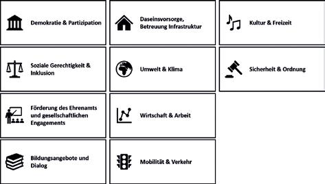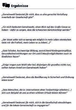 lungen zwischen Stadt- und Landbewohner:innen statistisch geprüft. Die Ergebnisse wirken zunächst etwas enttäuschend: Es konnten keine signifikanten Unterschiede in der Gemeinwohlorientierung – weder quantitativ, noch qualitativ – gefunden werden. Mögliche Gründe dafür sehen die Autor:innen in der gemeinsamen Geschichte, die eine kollektive Identität erzeugt bzw. verstärkt haben könnte, welche wiederum in gemeinsamen Erfahrungen (wirtschaftlichen Schwierigkeiten der Übergangszeit, Herausforderungen der Anpassung an eine neue politische und soziale Ordnung) verwurzelt sein könnten. Letztlich identifizieren die Autor:innen zehn Handlungsfelder zur Stärkung des Gemeinwohls, die nicht auf regionale Spezifika beschränkt sind und daher für alle öffentlich-rechtlichen Sendeanstalten und für sie arbeitenden Journalist:innen von Relevanz sein können: (1) Demokratie und Partizipation, (2) soziale Gerechtigkeit und Inklusion, (3) Förderung des Ehrenamts und des gesellschaftlichen Engagements, (4) Bildungsangebote und Dialog, (5) Daseinsvorsorge, Betreuung und Infrastruktur, (6) Umwelt und Klima, (7) Wirtschaft und Arbeit, (8) Mobilität und Verkehr, (9) Kultur und Freizeit sowie (10) Sicherheit und Ordnung.