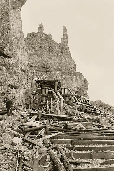 Ein kühn trassierter Frontklettersteig führte mit Hilfe von Holzleitern durch die senkrechte Nordwand zur Gipfelstellung, den der Zeitablauf schon seit Jahrzehnten unbegehbar gemacht hatte.