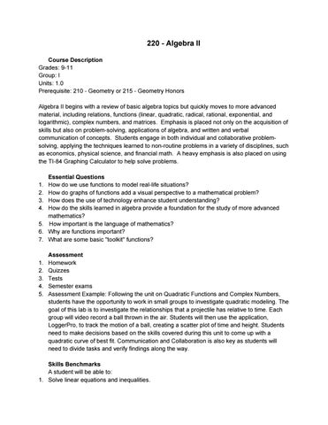 220 - Algebra II Course Description Grades: 9-11 Group: I Units: 1.0 Prerequisite: 210 - Geometry or 215 - Geometry Honors Algebra II begins with a review of basic algebra topics but quickly moves to more advanced material, including relations, functions (linear, quadratic, radical, rational, exponential, and logarithmic), complex numbers, and matrices. Emphasis is placed not only on the acquisition of skills but also on problem-solving, applications of algebra, and written and verbal communication of concepts. Students engage in both individual and collaborative problemsolving, applying the techniques learned to non-routine problems in a variety of disciplines, such as economics, physical science, and financial math. A heavy emphasis is also placed on using the TI-84 Graphing Calculator to help solve problems.