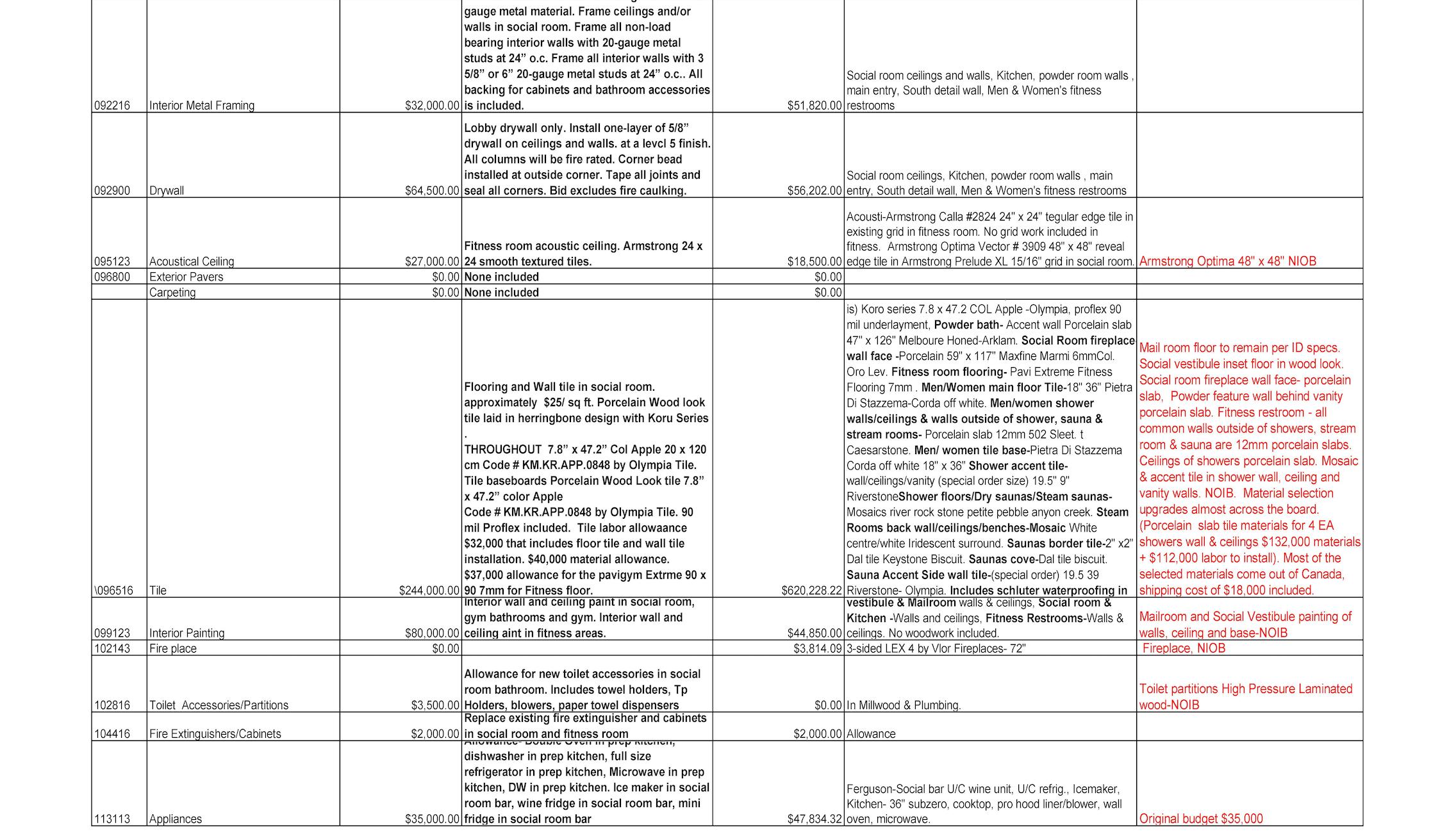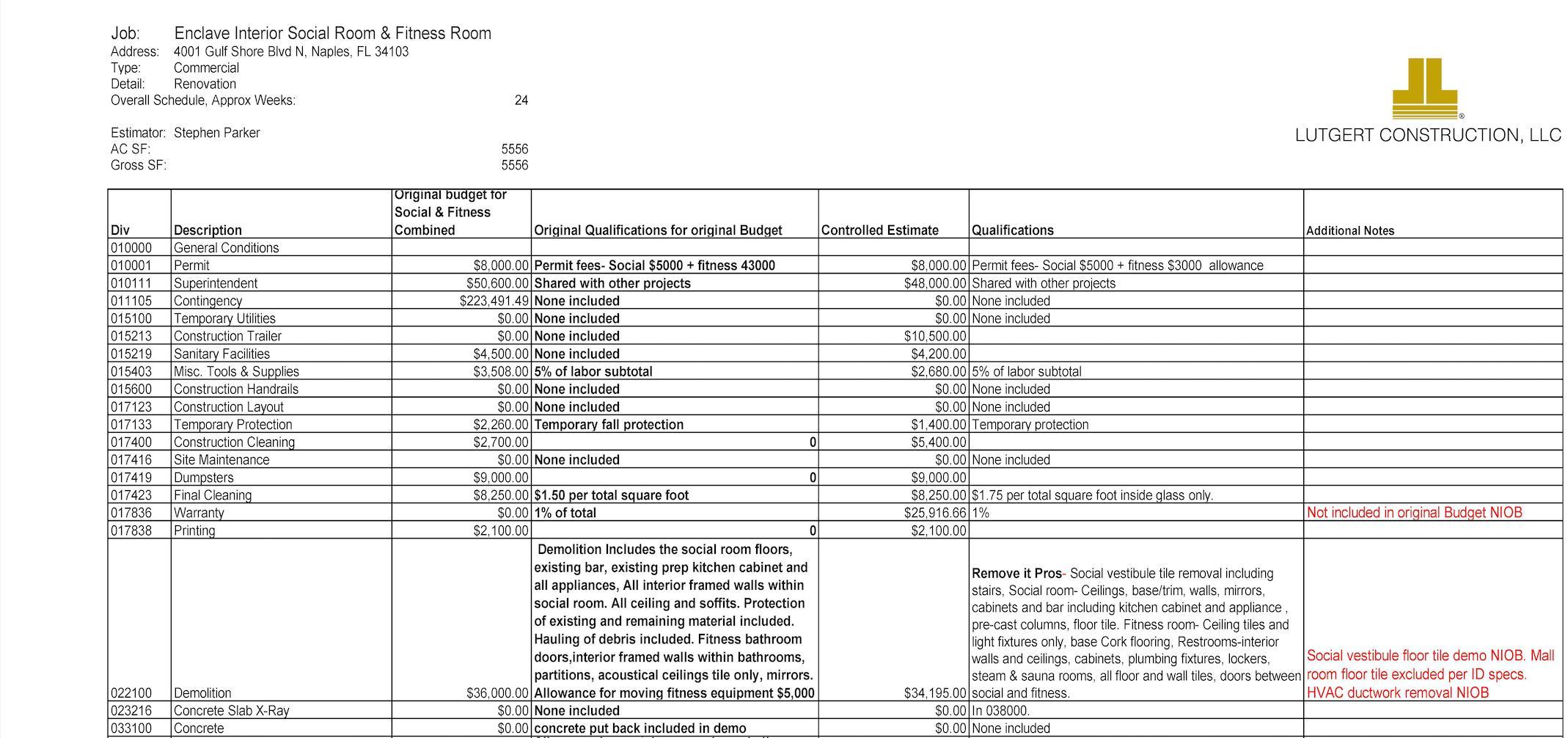 It’s our pleasure to provide this proposed Control Estimate for the Enclave Social and Fitness room renovations. We have included a comparison with our original budget for your review. A couple items to note: