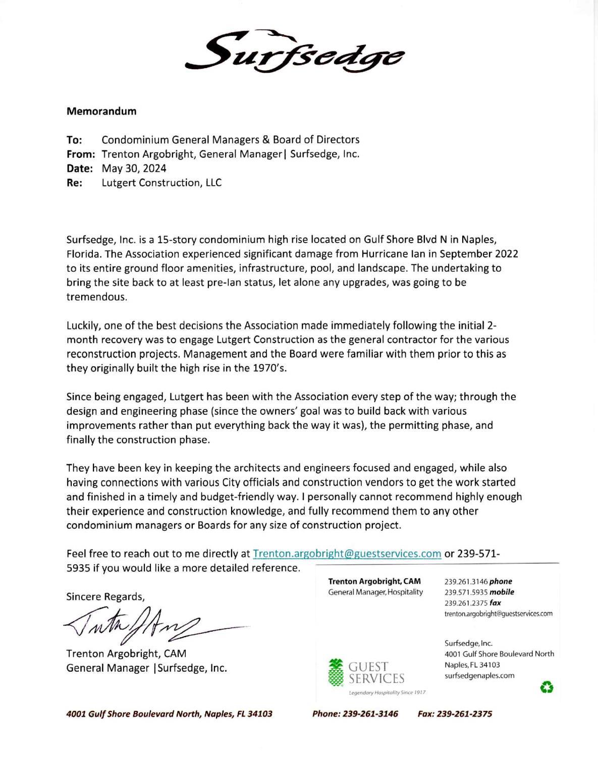 Construction in March 2016, most recently overseeing the construction of Lutgert’s newest development, Surfsedge in Vero Beach, Florida consisting of 12 luxury beachfront condominium units and 12 upscale beachside homes.