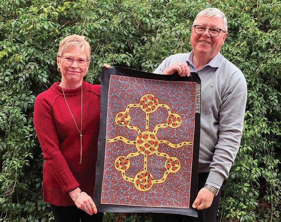 Many hours of sorting through old paperwork, assorted boxes and tubes later, they had not only signifcantly reduced the excess of documents, but had uncovered an authentic and certifed painting, Honey Ants (Yerrampe), by artist Julie Lechlietner. They also found dozens of wooden artifacts, including boomerangs, wommeras and other instruments.