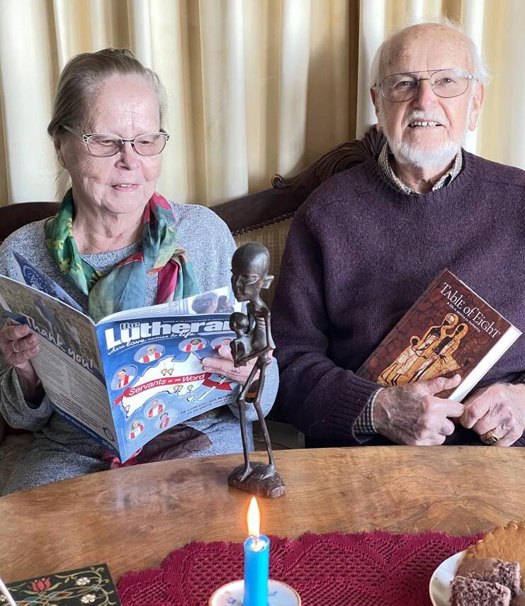 Dr Brian Neldner and his wife, Eeva-Liisa picked up a couple of good reads – the latest edition of The Lutheran and Brian’s newly published memoirs, Table of Eight –while relaxing at a welcoming afternoon tea table at home recently.