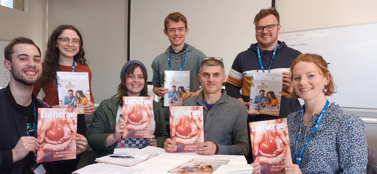 Participants in the Grow Ministries 2022 Young Adult Forum enjoyed a session with LCANZ Assistant to the Bishop, Public Theology Nick Schwarz (third from right), during last month’s gathering in Adelaide – and took a look at the coverage of the big social issues in The Lutheran. Among 24 young people from around Australia who took part were, from left, Noah Hahn (SA), Eloise Quinn-Valentine (SA), Guinevere Sellner (WA), Ben Huckel (SA), Stefan Volejnik (Qld), and Georgia Maroske (Vic). Read more about the forum on page 25.