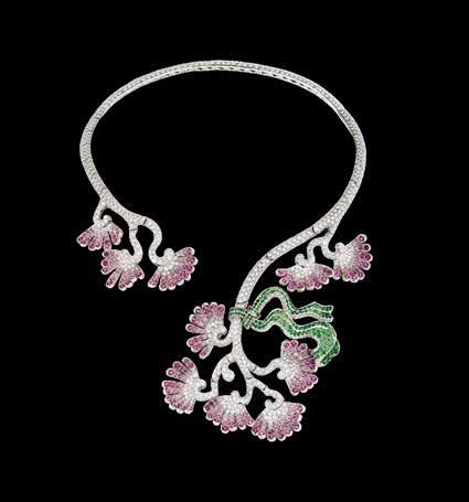 The Omikuji necklace was imagined in 2008 for Les Jardins High Jewelry collection. The shape of the branches and leaves in soft pink hues recall the peaceful Japanese gardens. A green ribbon, made of tsavorite garnets, seems to flow in the wind. The name of the creation, Omikuji, offers a clue as to its significance: a Japanese tradition whereby a fortune is written on a paper slip and then tied to a tree or fence. This poetic scene captures motion, beauty and luck – themes often explored by the Maison.